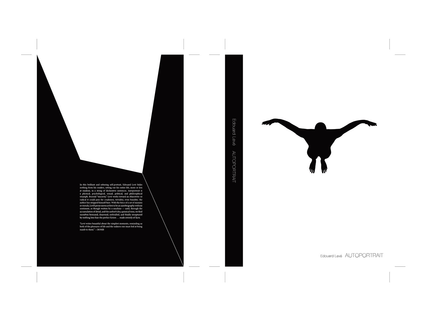 EDOUARD LEVÉ 是一個個性鮮明卻帶些悲傷氣息的人,透過他的自傳AUTOPORTRAIT,表露無遺他自身的個性與想法。而這本書有許多情緒上面的抒發與他自己情緒的見解,都以他非常自我主觀的想法意識詮釋他所認知的事情,整本自傳裡我們能感受到他有許多內心深層的想法,既是黑暗又離經叛道的態度在裡面 而此專案是為此書的封面做設計 以一個人張開雙臂翱翔在天,從天往下看這個世界的方式去做呈現,封面黑白配色上帶著理性又沈重的感受,從而表達此自傳所給讀者的感受。